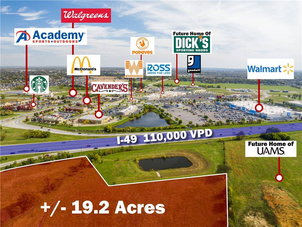 Exceptional Site Development Opportunity! +/- 19.2 acres of prime commercial land just off I-49 in Rogers, AR! This highly visible site offers direct access from Exit 81 and boasts full utility access, with water, sewer, and gas available at the street and electric available on site. Surrounded by top national retailers such as Walmart, Starbucks, Chick-fil-A, McDonald's, Academy, Ross, and a future Dick's Sporting Goods, the property is ideally positioned for high-traffic commercial use. Traffic counts reach approx. 110,000 VPD on I-49 and 18,000 on W Pleasant Grove Rd. Ideal spot for retail, big box, grocery, and more. Located just 2.5 miles from Top Golf and Walmart AMP, 10 minutes from the new Walmart World HQ, and less than 20 minutes to XNA. Additionally, University of Arkansas for Medical Sciences (UAMS) is building a new facility directly next to this site, and Schuber Mitchell Homes is set to develop +/- 520 housing units - fueling growth and foot traffic to this dynamic location.
