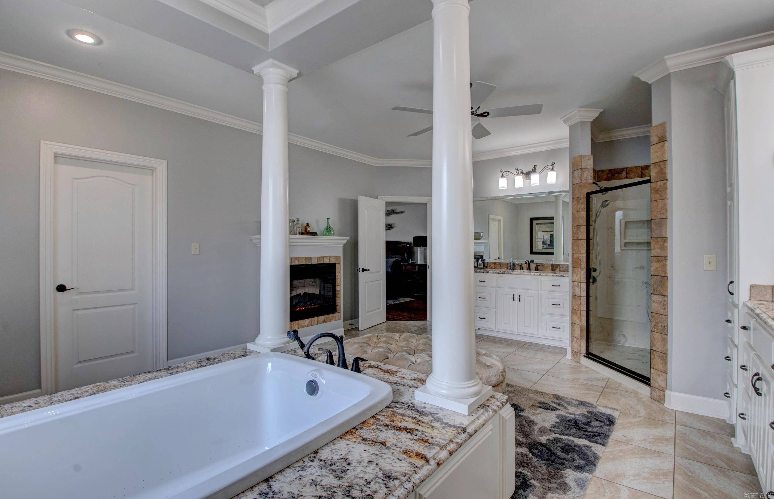 Exquisitely Designed and Custom Built For Your Style. A Definite Must See. Well Maintained Luxurious and Stately Home Featuring 3950 SF 4 Bedrooms 3 Full Baths 3 Car Garage. 1.5 Story, Bonus Room Above Garage. Primary Suite is Stunning with Tile and Granite, Double Vanities, Double Gas Log fireplaces for bedroom and bath, Sitting Area, Office Area, Jetted Soaking Tub and Walk In Shower. Absolute Dream Chef's Custom Built Kitchen, Cabinets feature Pull Out Drawer's for easy storage, nice sized Panty, Granite Tops, Sink Island, Wall Ovens and Sufficient Storage Space. Spectacular Ornate Custom Crown Molding, 10Ft Ceilings, 12FT Tray Ceilings, Arched Doorways, 14 Statuesque Columns in Living Room Area, Entrance and Primary Bathroom. Living Room with gas log fireplace, built ins, Flooring Engineered Hand Scraped Hardwoods and Tile. Lots Of Windows For Natural Lighting. Plenty of Storage Closets, Laundry Room. Massive Deck along the back of house with lots of space for entertaining.